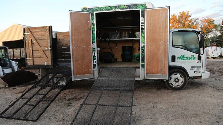 Gerry Andrews, president of Landscape Associates in De Pere, Wisconsin, had a lot of ideas for his own trailer setups from ones he’d seen at trade shows or at other companies. For instance, Landscape Associates has two trucks in its fleet for technical maintenance crews. The back half of these trucks can dump and the front half is a trailer with a large walk-in box with a ramp. These trucks have been ideal for work at residential sites or other sites that don’t need big mowers.