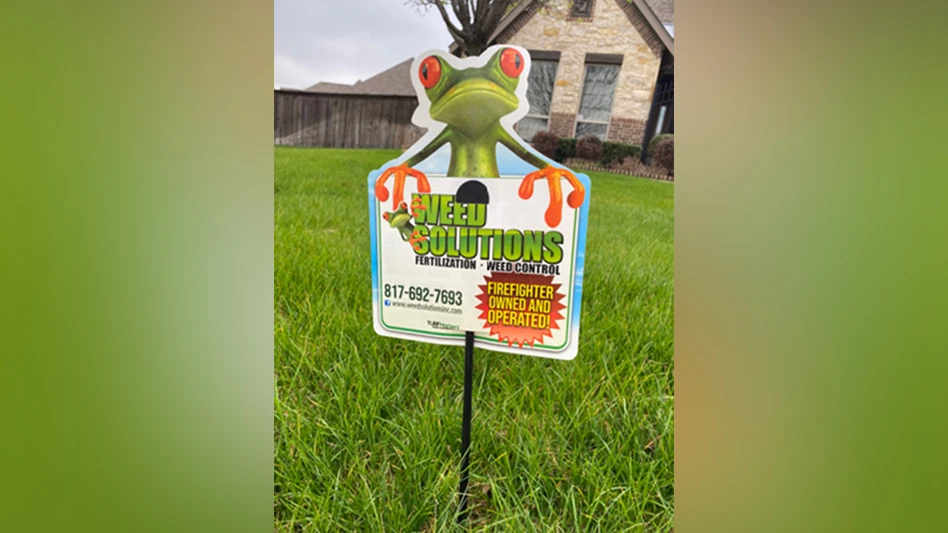 Acquiring new clients in the competitive Texas lawn care market calls for some creativity. You could say the Seetons take a go big or go home approach. Rather than a wallet-sized yard sign left on a lawn after an application, their 10-by-10-inch posters are emblazoned with the company’s frog mascot.