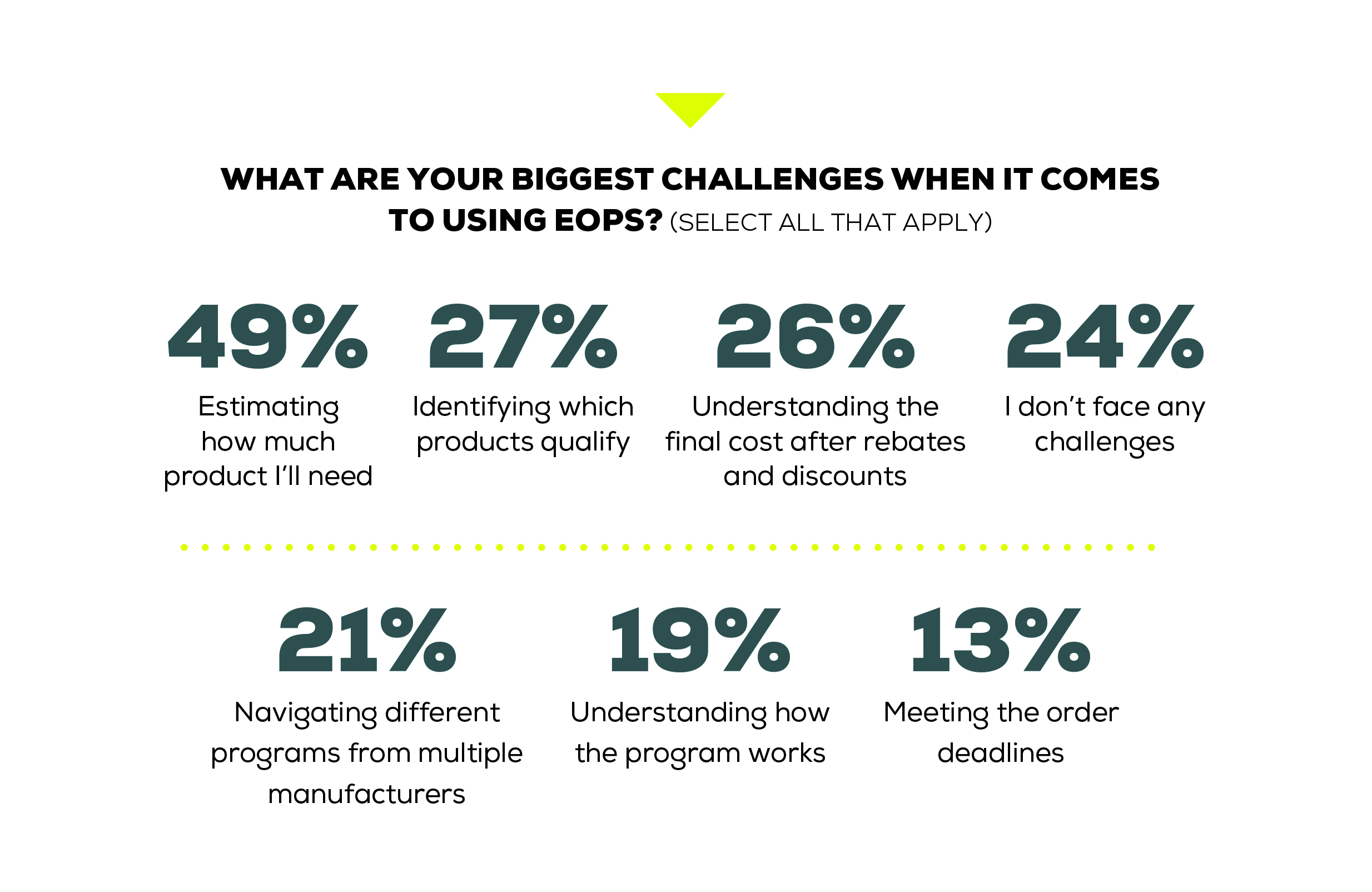 “Knowing your numbers and knowing what you need to order is essential,” he says. “It’s very easy with those EOPs to kind of get away from yourself and order way too much product. Try to keep yourself in line with the amount of materials you’ll need for the year. You don’t want to catch yourself ordering like two years’ worth of product in EOP just because you’re getting a good deal. At that point, your savings has kind of gone out the window.”