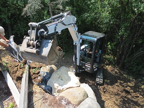 Now in its 15th year of business, Masseo Landscape has seen all kinds of difficult project conditions from bad drainage to clay to bedrock ridges. On one site in their service area of Ulster County, N.Y., there can be rock, sand and clay all within 100 feet of each other says President Mark Masseo. That’s where his team comes in. “We’re kind of known for being the problem-solvers,” he says. Many projects, whether it’s a retaining wall or paver install, are on tight deadlines, so the process needs to be efficient all the way from excavation to cleanup. Often homeowners are renovating for big occasions like weddings or graduations, so hitting the finish date is a must.