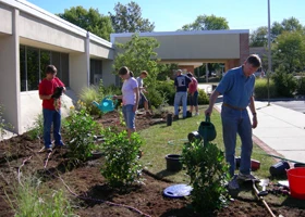 The left photo is an after shot of the butterfly and garden while the middle photo shows what the area looked like before the work. Right: Volunteers assemble a trellis. |
