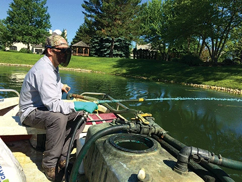 When starting a new job, an applicator begins by taking the pond’s vitals to determine pH, temperature, oxygen, presence of bacteria and depth of the pond, the latter which is done with a boat and GPS technology.