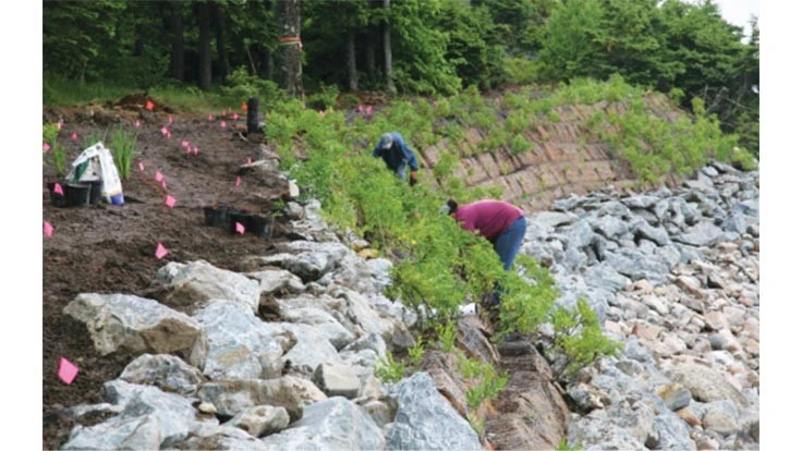 In Maine, stable shorelines include exposed bedrock with soil and tree roots. “We use techniques drawn from the principles of bio-engineering to analyze and stabilize eroded slopes,” Burdick says.
