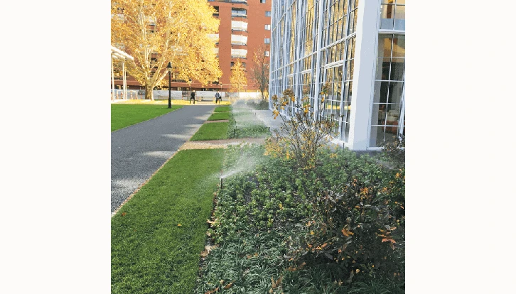 “There are some really good rotating nozzles that help cover larger areas,” he says. “Smaller areas where reduced runoff and over spray need to be provided for can be accomplished by using correct nozzles and spacing.”