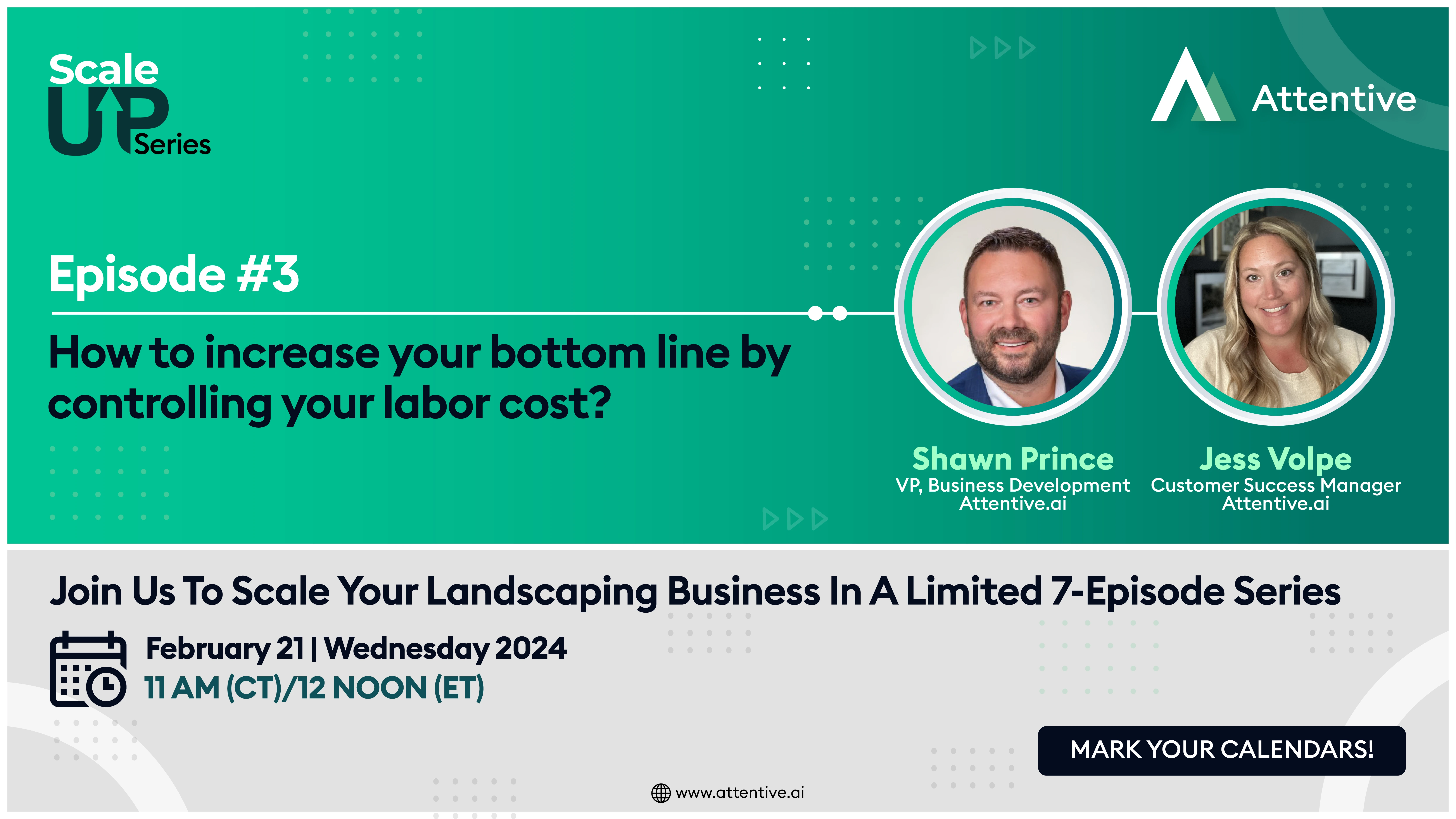 Shawn Prince, VP of business development, and Jess Volpe, customer success manager, at Attentive.ai will host the event scheduled for Feb. 21, beginning at noon EST. This webinar is the third episode in Attentive.ai’s limited 7-episode series designed to transform the way landscaping companies approach their labor tracking.