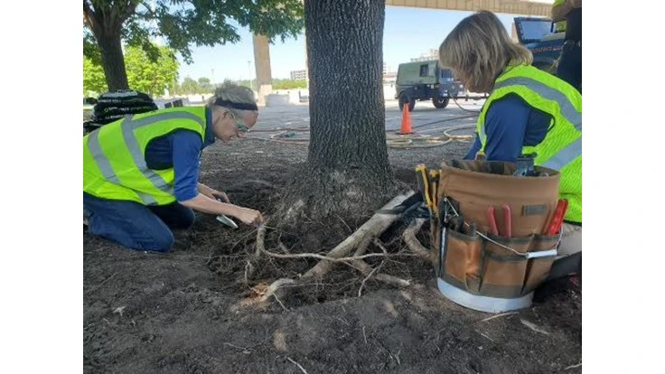 The treatments included root collar excavation and soil amendment with LESCO CarbonPro-G, a soil optimizer, among other products. Infected Ash trees can be identified by thinning leaf coverage, yellowing leaves, canopy and bark loss, and D-shaped holes.