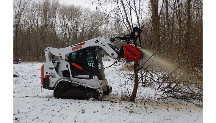 LEBANON, Ohio – Fecon introduces a new standard flow mulcher head which is ideal for use with most standard skid-steer loaders, Avant-type wheel loaders and other carriers that are able to provide 17-27 gpm of hydraulic flow, have enclosed cabs that can be properly protected with the appropriate polycarbonate guarding and have the ability to carry the 1300-pound attachment. The new mulcher head features 22 knife or carbide-type cutting tools and has a 50-inch working width. Operating from 2400 to 3600 rpm, it can shred brush and small trees up to 4-inches in diameter, making it an excellent tool for rental fleets as well as landscapers, arborists, farmers, ranchers, landowners/property managers, parks & recreational facilities, municipalities, Christmas tree farms and others tasked with managing brush and vegetation.