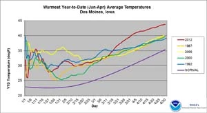 The 12-month period of May 2011-April 2012 has a nationally-averaged temperature 2.8°F above the 1901-2000 long-term average, while the January-April 2012 months were 45.4°F, 5.4°F above the long-term average.