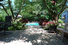 - Synopsis: The 20 year old pool was rehabilitated, grading corrected, natural bluestone coping custom cut and old decking recycled to provide patio base material or re-used. The patio area was designed to accommodate gatherings, entertaining and cooking, yet preserve the wild/natural feel provided by mature dogwoods and native landscapes. The terraced steps from the rear yard to the front were laid out to double as access to raised planting and vegetable bed borders, working with the natural grade and space constraints posed by the mature landscape. A hidden shed area was restored into a garden-prep area, complete with Potting Benches and storage. The deck area was accomplished by re-using found tables where the old 70s masonry pool bricks were once acid-washed, adding to the charm of the space.