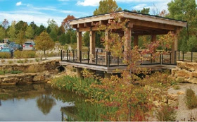 Among the features Novus developed with SWT Design and others for the nine-acre headquarters was a parking lot with stormwater retention features, a walking trail that winds through restored prairie and other habitat, and a vegetable garden that staff maintains. The garden is fed by a windmill-powered well that retrieves rainwater stored underground. A detention basin captures stormwater on site and provides aquatic habitat and a scenic view from a nearby pavilion topped with a vegetated roof.