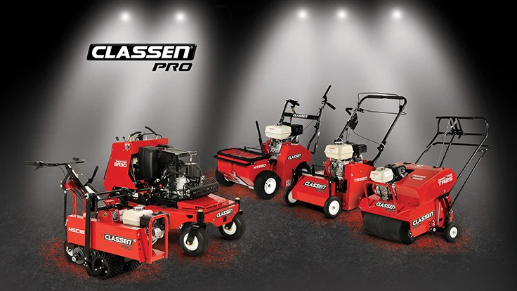 SOUTHAMPTON, Pa. – Classen has introduced its Classen PRO line of landscaping equipment for commercial landscape contractors and rental centers. The new line offers productivity-enhancing features, such as hydrostatic transmissions, anti-vibration grips and power steering. These features help professionals complete projects quickly, allowing them to take on additional projects in the same amount of time. The product line includes five products, a new stand-on aerator, a walk-behind aerator, an overseeder, a sod cutter and a turf rake.