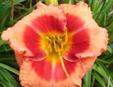 Flowers of Bahama Pink Sky Daylily have wide, medium flesh-pink petals accented by a wide, rosy red eye-zone and a contrasting yellow throat; the combination evokes soft pink tropical sunsets. Wide, overlapping petals are lightly ruffled with the barest hint of a faint rose picotee outlining some edges. The rosy-red eye covers nearly half of the rich and clear pink petal surface, creating a dramatic two-tone effect in the landscape. In warm weather, the medium size flowers recurve, presenting a chic, round shape.