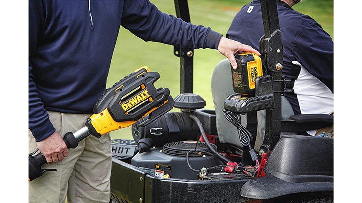 TOWSON, Md. – DeWalt introduces the 40V MAX* mower/vehicle charger (DCB412), compatible with all 40V MAX* outdoor power equipment batteries. Hooked up to a truck or strapped to a mower to charge on-the-go, it provides convenient mobile charging for landscapers. Including a truck power input, a mower battery connection and a mower mount, the charger can be attached to a mower in a variety of orientations to make the battery secure and accessible.