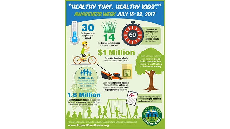 CLEVELAND, Ohio – To raise awareness and funding for the preservation of parks and recreational green spaces, Project EverGreen is designating July 16-22, 2017 as National “Healthy Turf. Healthy Kids.” Awareness Week. The week will raise recognition of the program and spotlight the program’s efforts to provide safe, well-maintained and accessible parks and recreational green spaces for children and communities across the United States.