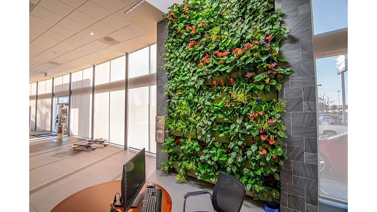 Installed in January 2016 by Outside Matters Landscaping (El Segundo, Calif.), the Subaru Pacific green wall is 13 feet, 7 inches high and 8 feet wide. Totaling 110 square feet, it has ten rows, each with six LiveWall modular wall-planters lined with plant container inserts that have a mix of six different indoor plants. Florasource (San Clemente, Calif.), an independent horticulture supply company and Southern California LiveWall representative, advised LACarGUY on green wall design and plant selection and provided 120 pre-grown nursery plants in the containers.