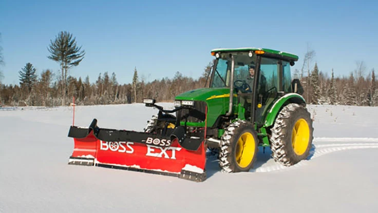 Also, BOSS added the SK12 as its latest product in its skid-steer box plow lineup. The SK12 serves as a trip-edge box plow that helps to move large amounts of snow with each pass. A self-adjusting hitch enables the blade to adjust to any terrain. It also features rugged support struts to add structural strength and stability. BOSS offers Tractor Plows in straight-blade and v-plow options for select John Deere and Kubota tractor models, as well.
