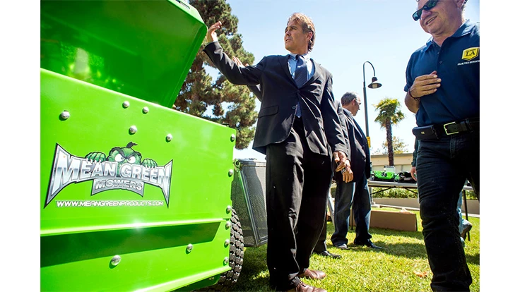 On Tuesday, the district applauded Cal State Los Angeles’ changeover of grounds crews to all-electric equipment. The university – located just a few miles east of downtown Los Angeles and in the shadow of the San Gabriel Mountains – may be the first in the state to swap gasoline-powered lawn mowers, edgers, weed-whackers and chain saws with zero-emission, battery-powered ones.