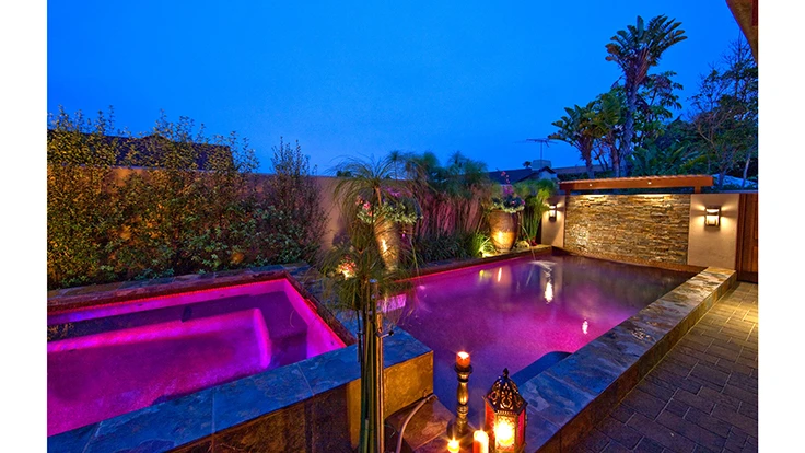 This project posed a challenge as the space Solena Landscape and owner/designer Mitch Kalamian had to work with was limited. But the homeowners in Huntington Beach, California, were adamant they wanted a pool they could swim laps in, as well as a spa that could accommodate their large family and a handicapped child.