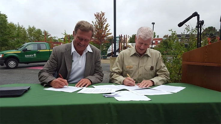 The Davey Tree Expert Company and the U.S. Forest Service made history Wednesday by formally committing to a partnership that will coordinate research on forest assessment, expand delivery of cutting-edge tree science, further youth education and strengthen connections between communities and their trees. Davey chief operating officer and president of U.S. operations, Pat Covey, and U.S.F.S. Chief Thomas Tidwell signed a memorandum of understanding that commemorates a 10-year partnership. The two organizations helped develop i-Tree, a software program designed to help urban natural resource managers and the general public better understand the benefits trees provide us and to further promote a greater understanding of the role trees play in our environment. The partners celebrated this collaborative effort by planting a 15-foot red maple tree at Barnard Elementary School in Washington, D.C., on Wednesday, Sept. 30.