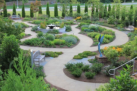 The same garden also uses on-site compost to build soil health. All of the organic waste – sticks, limbs, tree trunks – is composted to eliminate adding to the landfill. Also, many of its components were designed to teach students about nature.