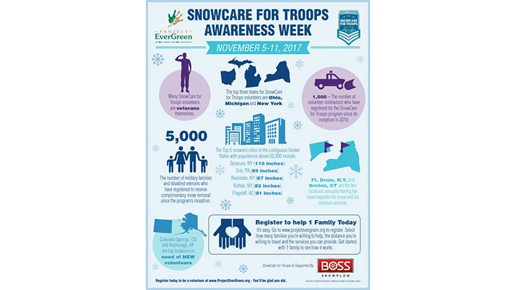 For families of deployed military personnel and post-9/11 veterans with a service-connected disability, clearing driveways and sidewalks of snow and ice can be a hardship. To help military families and disabled veterans overcome those challenges, Project EverGreen, in partnership with BOSS Snowplow, established the SnowCare for Troops initiative in 2010 to provide complimentary snow and ice removal services to help these individuals.