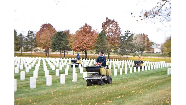 The evnet in Dayton began with a welcome from the director of the Dayton National Cemetery, Posting of Colors by the Dayton National Cemetery Honor Guard and opening remarks by the Ohio Lawn Care Association’s Executive Director. Speakers included Mark Kucharski, the president of the Vietnam Veterans Memorial Park, and Vietnam veteran and distinguished cross recipient Mick Dehart. Rep. Rick Perales attended the event, which concluded with a rifle salute, playing of Taps and the Retirement of Colors. Over 30 volunteers fertilized and laid mulch on the grounds.