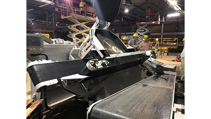 The saw is 16 feet long, seven feet wide and seven feet tall, with a 36-inch blade. It can be loaded with 12 pavers or 15 face brick at a time and is capable of cutting about 4,000 thinner versions of Pine Hall Brick’s products in an eight-hour shift, said Preston Steele, vice president and thin products business manager.