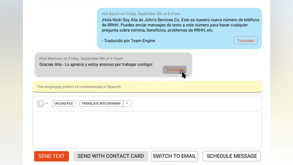 Team Engine, a HR automation software platform for the green industry, has released a new feature that allows its users to communicate over text with applicants and employees who don’t speak English.
