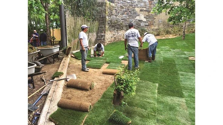 Temperature and precipitation are two key considerations when it comes to laying sod. If temperatures are in the 80s, Lachance prefers installing sod rather than spreading seed because seed “takes way more to keep watered, and with sod we can just water a few times a day.” In addition, he opts for sod when heavy spring and fall rains may result in seed runoff.