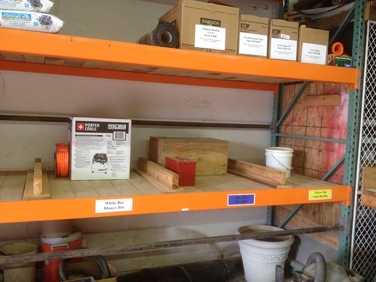All supplies are labeled in both English and Spanish at Land Creations so that the five H-2B workers and English-speaking employees can find what they need easily. John Deere Landscapes stocks supplies like grass seed, lighting and fertilizer once a week.
