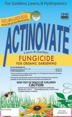 ACTINOVATE FUNGICIDE FOR LAWN & GARDEN contains microorganisms beneficial for organic gardening.