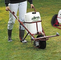 Liquid is gravity-fed to the wheel-driven gear pump where it is pressurized and delivered to the non-drip nozzles at pre-calibrated rate