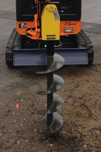 Borer mounts directly to the carrier’s shovel or arm, or under an attached top plate for quick-release couplings