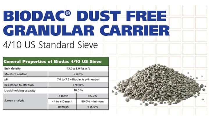 Commercial granular formulations and applications with Biodac 4/10 include: aquatic herbicides; mosquito and insect control products; specialty crop, fruit, and vegetable control products; ornamental and horticultural products; biostimulant, biopesticide, organic, natural, biological and bionutritional granular control products