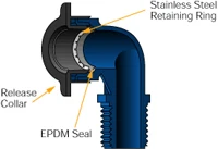 Uses a stainless steel retaining ring that grips the flexible pipe from the outside