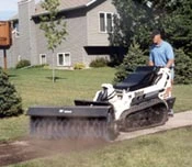 Can be equipped with a number of attachments, including: angle broom, auger, bucket, tiller, trencher and utility grapple
