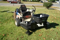 Attachment deck for any front mounted zero-turn lawnmower Deck implement features an independently plumbed dual tank Adds no additional size and little added weight At least 12 compatible makes and models available Spreaders Powered Spreaders