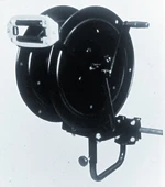 Adjustable split bearing break assembly allows for a number of tension settings, and a captive hose guide roller assembly provides smooth payout and rewind