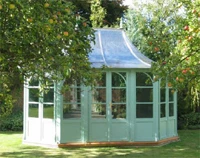 Features array of summerhouses, arbours, gazebos and pavilions Provides colour matching service Summerhouses furnished to the same level as any additional room Features lighting, heating, and interior furnishings