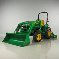 Attachments include quick-attach loader and bucket, mid-mower and backhoe