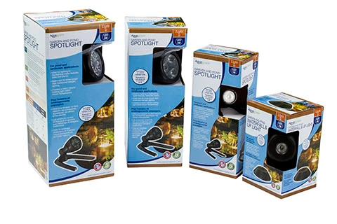 Aquascape’s LED Garden and Pond lights are available in a variety of options, including three sizes of LED spotlights, an LED waterfall and landscape accent light, LED fountain accent light, and a DIY spotlight kit that includes 3 lights pre-wired for easy installation.