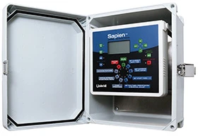 Sapien features a new line of customized enclosures that protect the system from weather elements, vandalism and pests. The enclosures are available in heavy-duty plastic or stainless steel as wall mounts or pedestal-style. The plastic wall mount cabinet (pictured) has a strong, lockable front entry door and measures 11.5-in. high x 9.25-in wide x 5.5-in. deep. Heavy-duty stainless steel cabinet measures 15.25-in. high x 12.75-in. wide x 4.75-in. deep and includes controller / transformer mounting hardware.