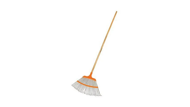 The Leonard Poly-Steel lawn rake has a 22.5-inch head with 25 tines. It has a poly brace and a large diameter 54-inch hardwood handle.