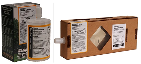 The new antibiotic line has two chemical products for trunk injection treatment. Terrier Antibiotic is available in 120 ml and 1000 ml Quick-Connect Chemical Packs and treats Bacterial Leaf Scorch in Elm, Oak, Sycamore, Oleander and Sweet Gum trees; Fire Blight in Mountain Ash trees; Ash Yellows in Ash trees; and Phloem Necrosis in Elm trees (also called Elm Yellow). A 120 ml pack treats approximately 20 trees with a 12” DBH. Preventative applications are more effective than suppressive treatment in trees showing disease symptoms. Springer Antibiotic is available in 1000 ml Quick-Connect Chemical Packs and is for seasonal suppression of lethal yellow disease in palms. It can be used anytime during the growing season. A 1000 ml pack treats approximately 25 palms with a 12” DBH. Both contain Oxytetracycline Hydrochloride.