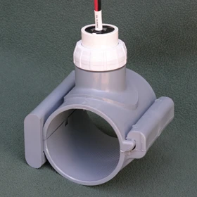 These saddle type sensors utilize the same flow sensor insert used in the tee type FSI Series sensors. The sensor insert mounts in a housing that controls the depth and alignment of the impeller, unlike insert type sensors that may be mis-aligned or set to the wrong depth. The housing is permanently attached to the PVC saddle therefore no additional mounting hardware is required. They are rated to operate at pressures up to 150 psi.