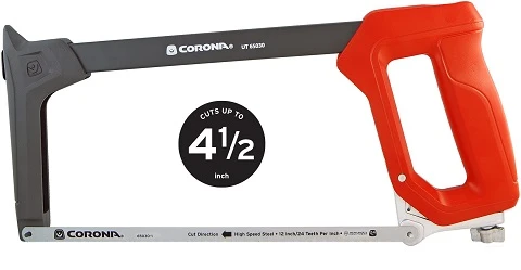 This hacksaw cuts up to 4 ½ inches. It offers a 12-inch high speed steel blade with 24 teeth per inch, and an oversized ergonomic handle. Use it to cut PVC pipe up to 4 ½ inches, or other materials.