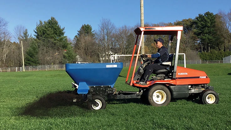 This makes handling heavier products feasible without sacrificing maneuverability or ease of operation. Whether applying compost, sand, soil or a custom blend to existing turf, the ECO 600’s larger capacity hopper (22 cu. ft) and out-front design allows professionals to broadcast bulk material in a 180-degree arc, making topdressing quick, smooth and effortless.