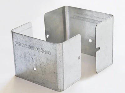 Designed and manufactured in America, the product is manufactured from G90 galvanized steel and stamped with 55-ton press. Its design incorporates radial corners that are easy on a trimmer’s cutting line, so it won’t cause wea,r and at the same time aesthetically mimicking post contours. The reflective quality of the standard galvanized Fence Armor product makes it almost invisible as it reflects the grass around it. Fence Armor also comes in a variety of colors and textures to suit all fence types.