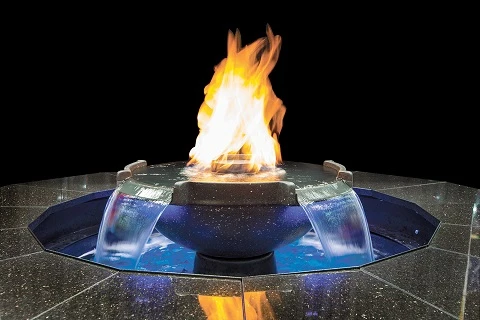 A finalist for Hearth and Home magazine’s VESTA Award for 2015’s most innovative outdoor product, H2OnFire is sold fully assembled with a self-contained, filtered, auto-refill water system with protective sensors, Copper Cyprus Bowl or Concrete Monaco Bowl in Black or Burnt Sienna and wall switch control of fire, water and lights.