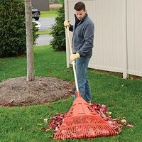 Lighter weight than steel rakes, you can cover a lot of ground with this rake. Multiple ribs add reinforcement to the head at the handle connection. Inverted T-ribs add strength and shape-holding ability to the rugged tines. The stand-out orange color means your rake won't get lost in the yard. it comes with a lifetime warranty.